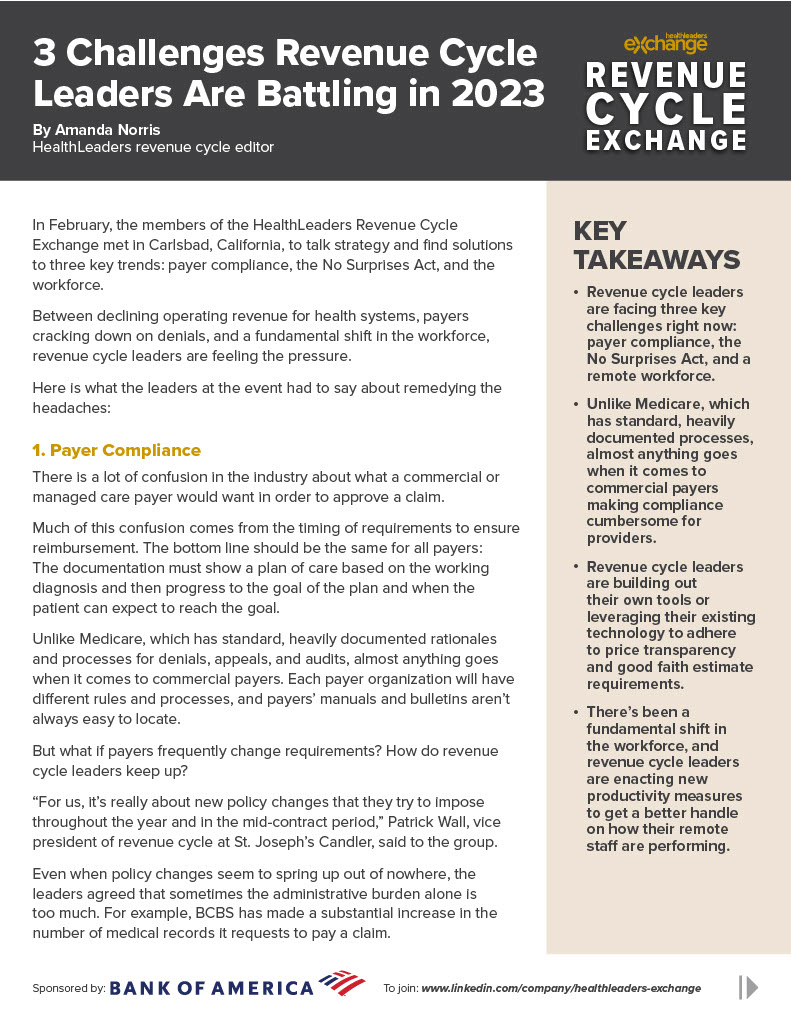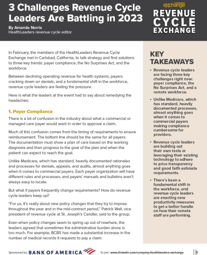 In February, members of the HealthLeaders Revenue Cycle Exchange met in Carlsbad, California, to talk strategy and find solutions to three key trends: payer compliance, the No Surprises Act, and the workforce.