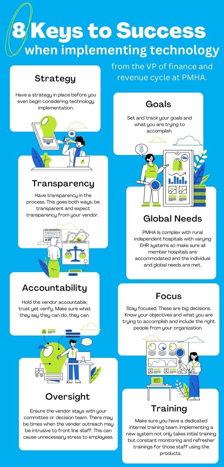The VP of finance and revenue cycle at PMHA outlines eight keys to success when implementing technology.