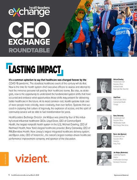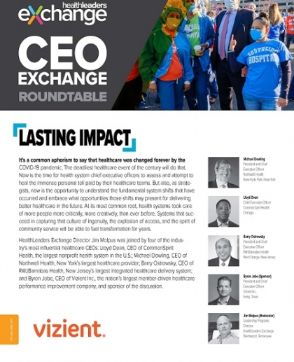 Recently, HealthLeaders Exchange Director Jim Molpus was joined by four of the industry’s most influential healthcare CEOs: Lloyd Dean of CommonSpirit Health, Michael Dowling of Northwell Health, Barry Ostrowsky of RWJBarnabas Health, and Byron Jobe, CEO of Vizient Inc.