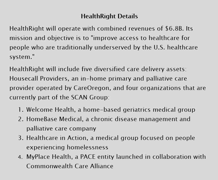Jain—the current CEO of SCAN Health Plan and its parent company, The SCAN Group—will become the CEO of HealthRight Group. HealthRight is a new nonprofit healthcare organization that will combine the California-based SCAN Group and CareOregon to serve nearly 800,000 Medicare and Medicaid members in five states, provided regulators approve the merger.