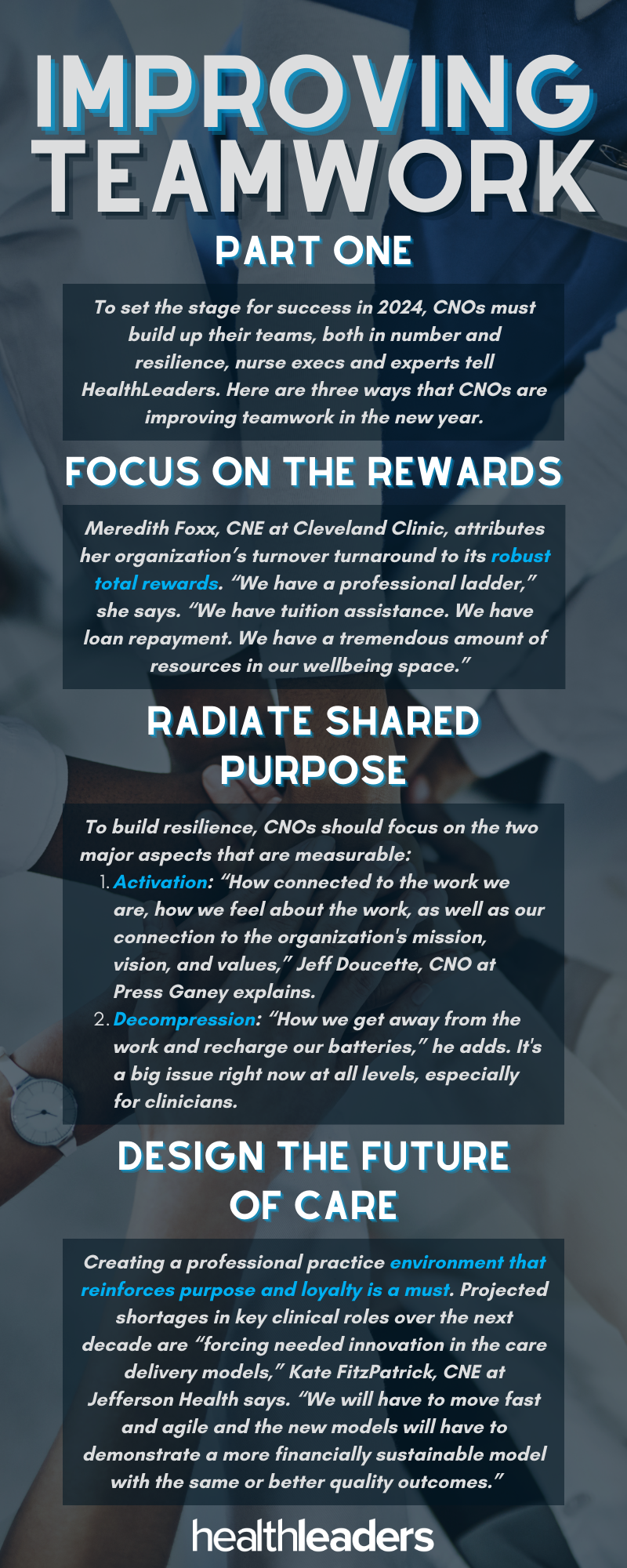 To set the stage for success in 2024 and beyond, CNOs must build up their teams, both in number and resilience, nurse execs and experts tell HealthLeaders. That means making compensation compelling, fostering shared purpose, redesigning care models, and playing a very long game when it comes to recruiting.