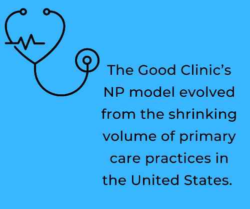 The Good Clinic’s NP model evolved from the shrinking volume of primary care practices in the United States.