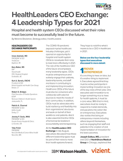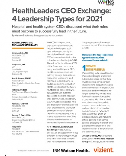 The COVID-19 pandemic has exposed numerous healthcare industry issues, while presenting opportunities for hospital and health system CEOs to reevaluate their roles. To lead more successfully in the future, the role of the healthcare CEO needs to encompass: Proven Entrepreneur, Active Convener, Chief Accountability Officer and Compassionate Advocate. The Aug. 27, 2020 HealthLeaders CEO Exchange brought together executives to share how they are expressing these attributes in leading their organizations.