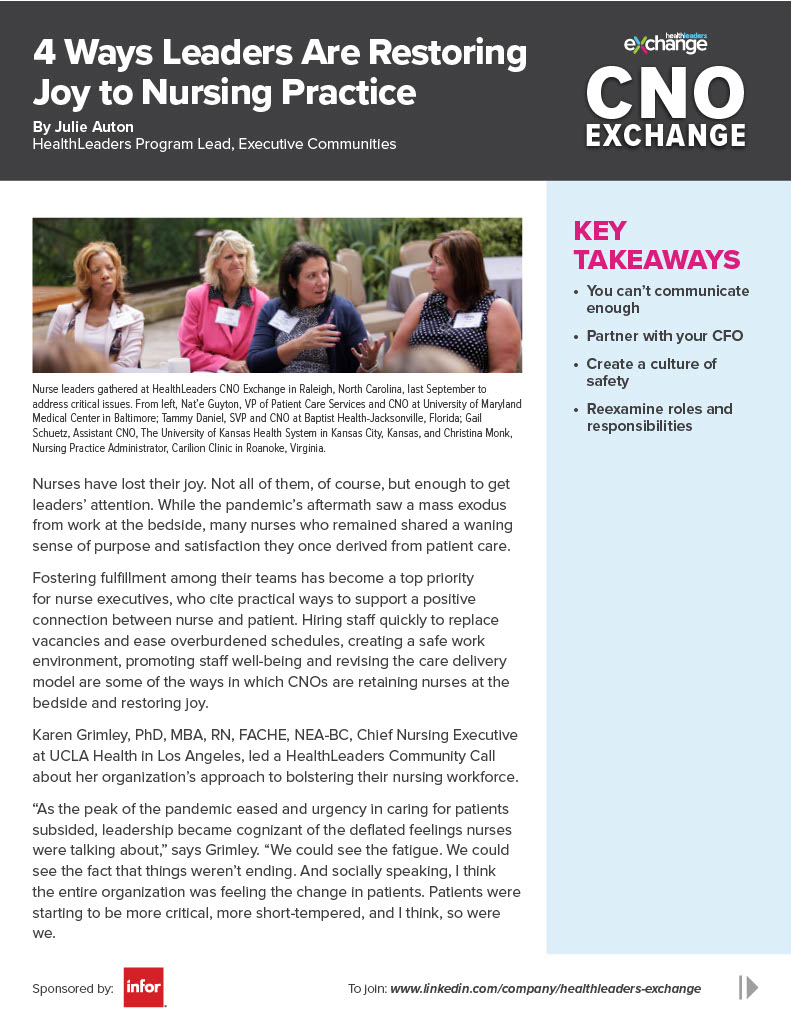 Fostering fulfillment among their teams has become a top priority for nurse executives, who cite practical ways to support a positive connection between nurse and patient. In this exclusive report, hear from nurse leaders about how they are restoring the joy to nursing.