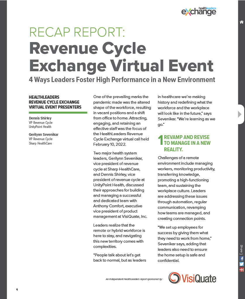 Two major health system leaders, Gerilynn Sevenikar, vice president of Revenue Cycle, Sharp HealthCare, and Dennis Shirley, vice president of Revenue Cycle, UnityPoint Health, discussed their approaches for building and managing a successful and dedicated team with Anthony Comfort, executive vice president of product management at VisiQuate, Inc.