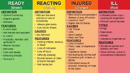 Green means everything is proceeding smoothly, and the individual is in control, with optimal functioning. As stress builds, an individual may experience mild distress and feel irritable (yellow), severe and persistent distress (orange), and finally, stress causing life impairment (red).